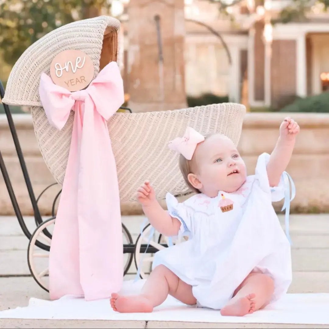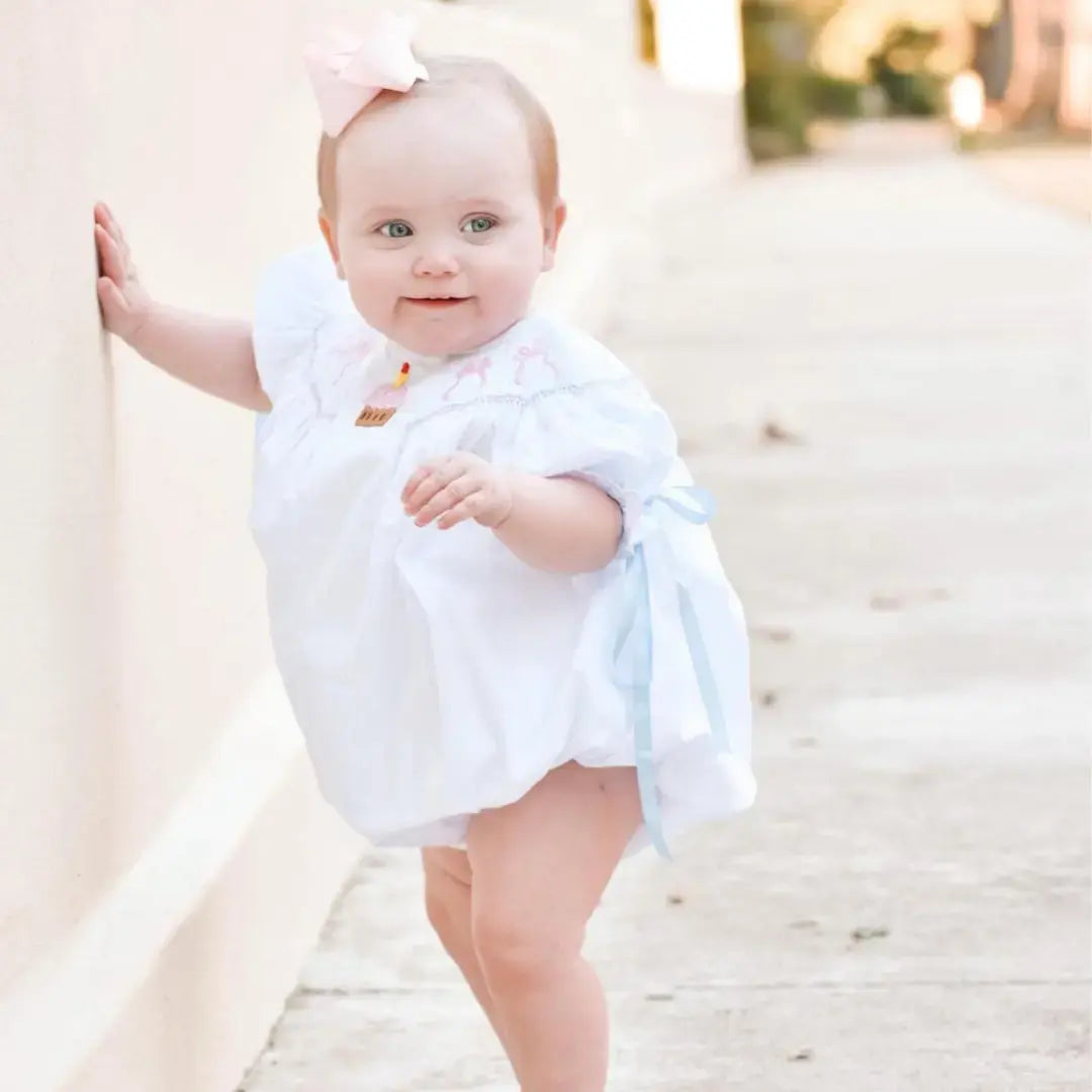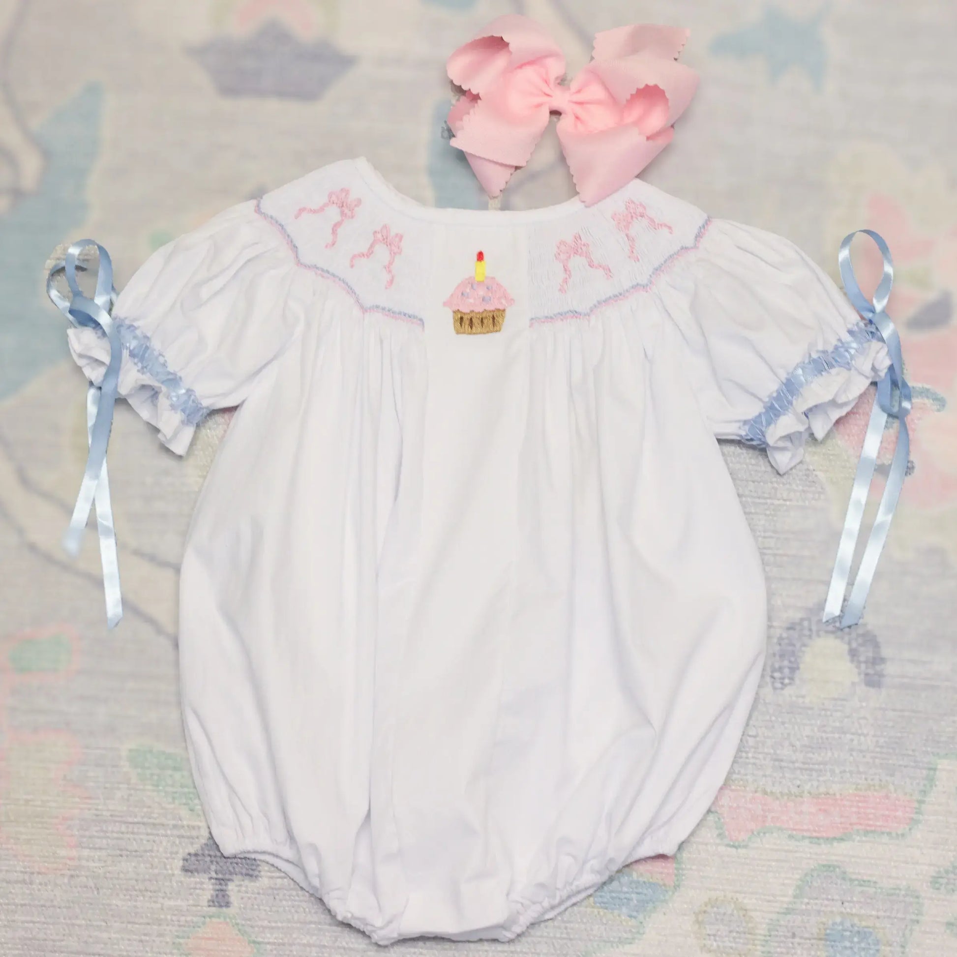 Celebrate in style with this adorable BIRTHDAY BOWS SMOCKED BUBBLE! Featuring smocked cupcakes and bows with satin ribbon detailing, this outfit is perfect for the birthday girl!