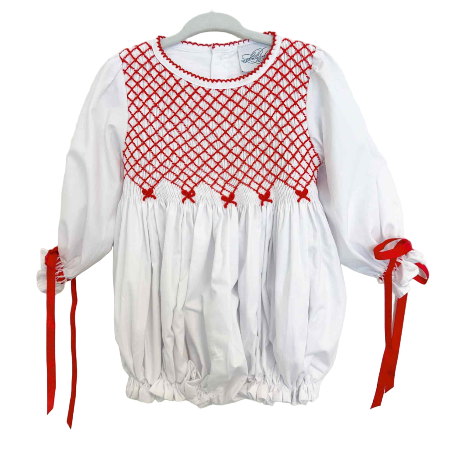 This charming bubble features eye-catching geometric smocking paired with delicate bullion bow accents that add a touch of elegance. Fully lined for comfort and durability, it's a stunning piece that combines intricate craftsmanship with playful style. Perfect for little ones who love standing out in the sweetest way possible!