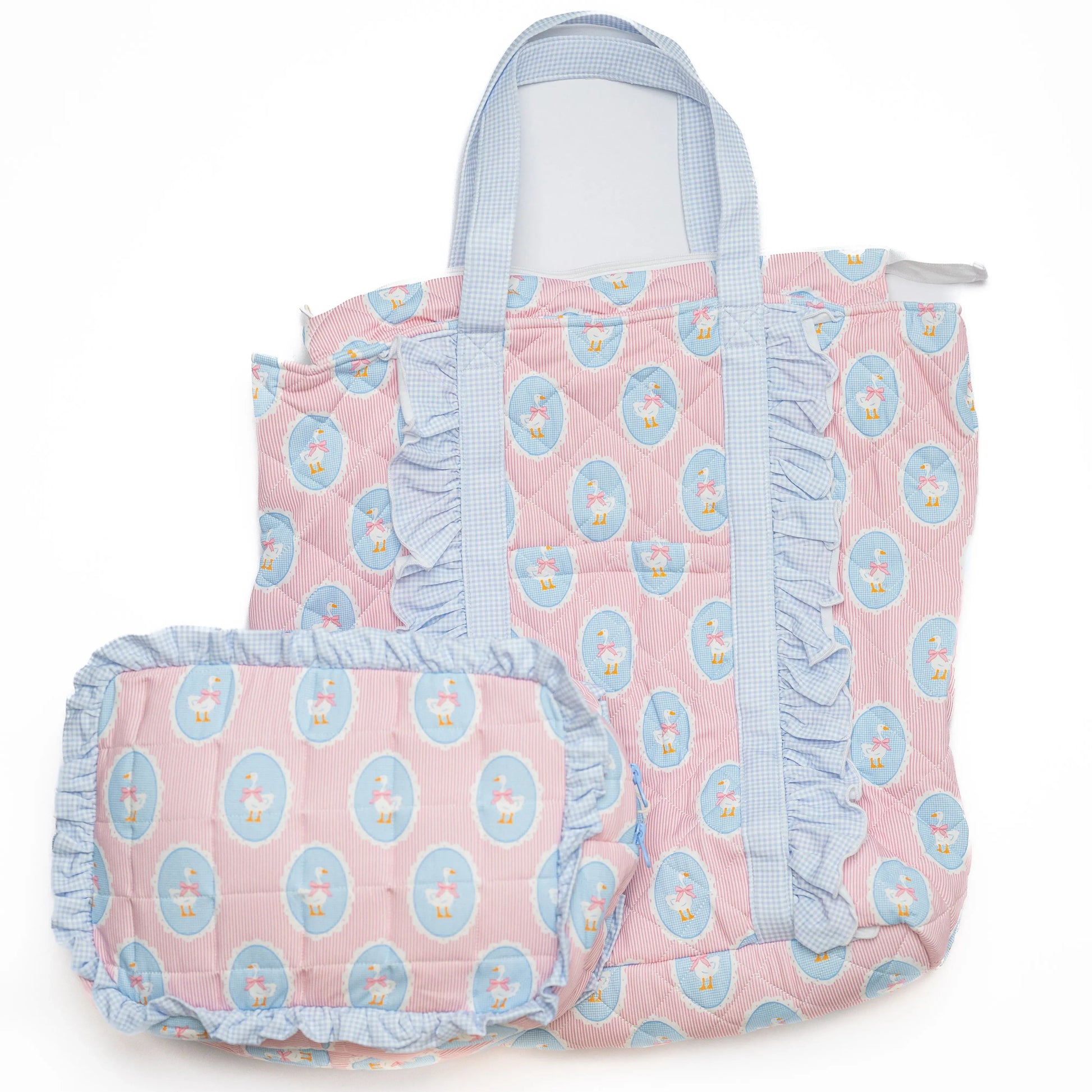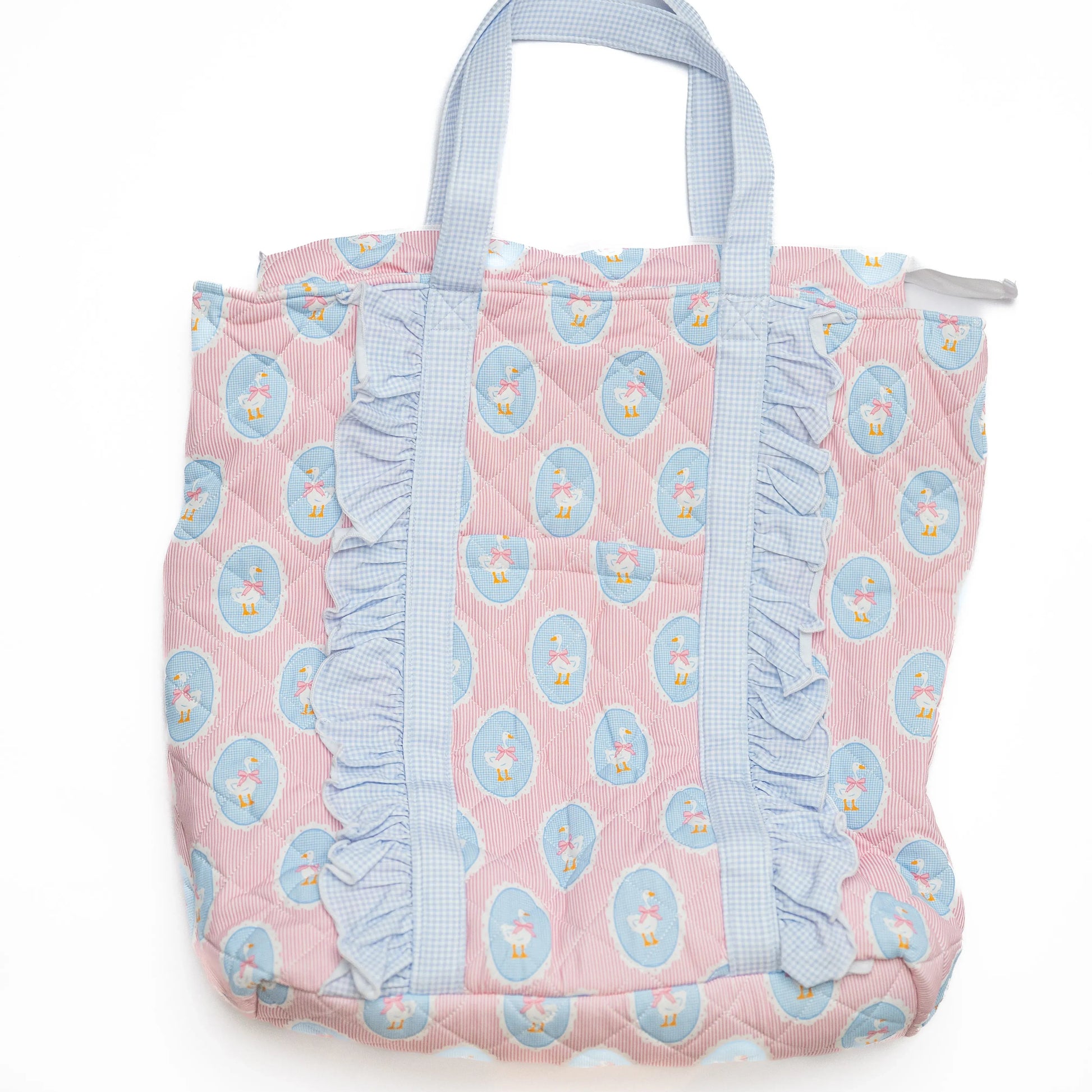 This Goose Quilted Ruffle Tote brings a playful touch to your everyday carry with its charming print and delicate ruffled accents. Featuring a handy outside pocket, it’s perfect for keeping essentials close at hand while adding a fun, flirty flair to any outfit. Whether you’re running errands or meeting friends, this tote combines style and practicality effortlessly.