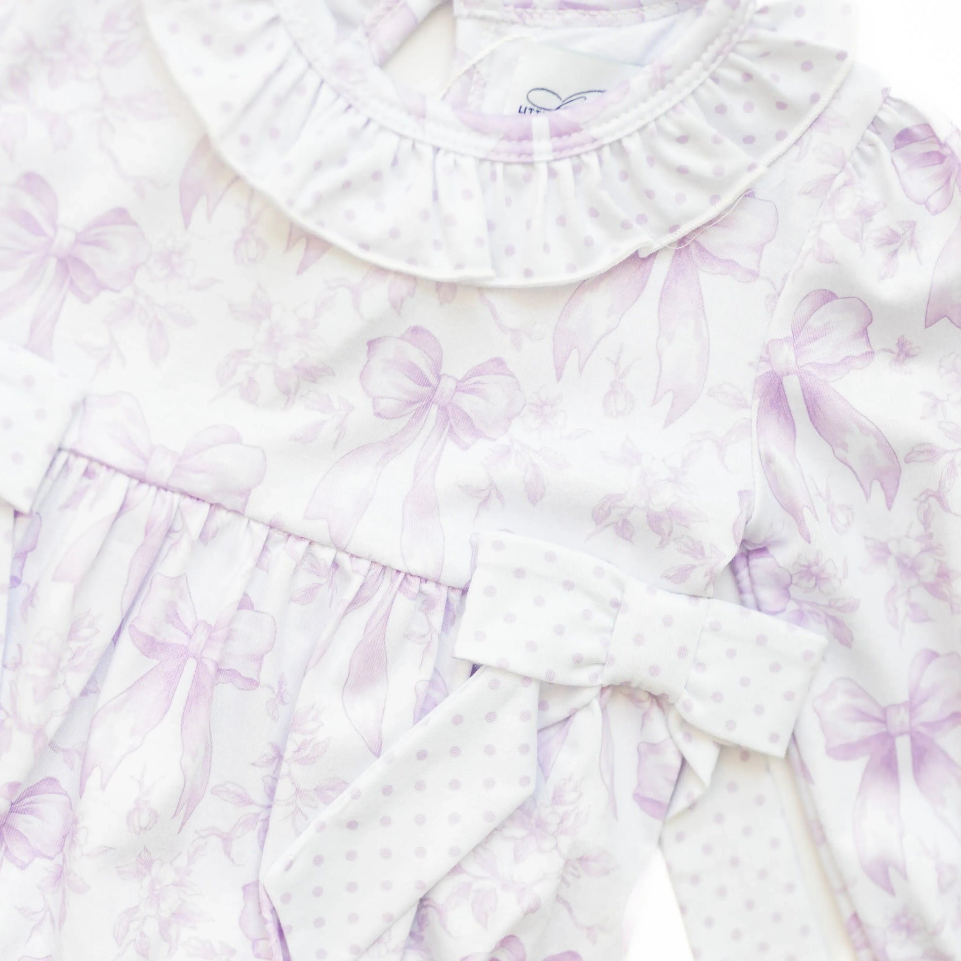 Twirl in style with this charming lavender bow toile legging set! Featuring an adorable ruffle collar and delicate bow details, it's the perfect blend of sweet and sophisticated. The soft toile pattern adds timeless elegance, while the playful ruffles bring extra personality to playtime or special occasions. Comfortable enough for all-day wear, this set is sure to have little ones feeling fancy and fabulous.