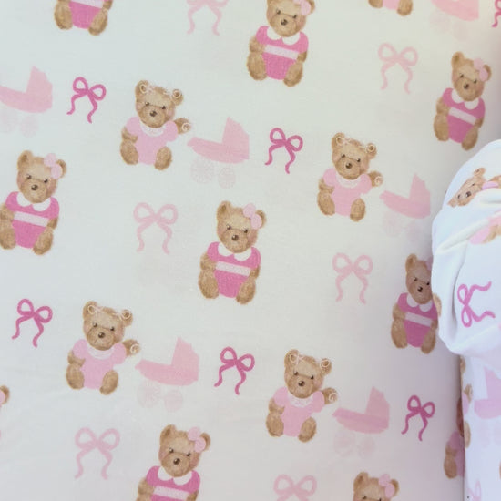 Wrap your little one in softness with this adorable bamboo blanket featuring an exclusive hand-drawn design by Jessi. Playful teddy bears and delicate bows dance across a pretty pink backdrop, making cuddle time extra special. Crafted from silky-smooth bamboo fabric, it's gentle on sensitive skin and naturally breathable. This one-of-a-kind print is sure to become a cherished favorite.