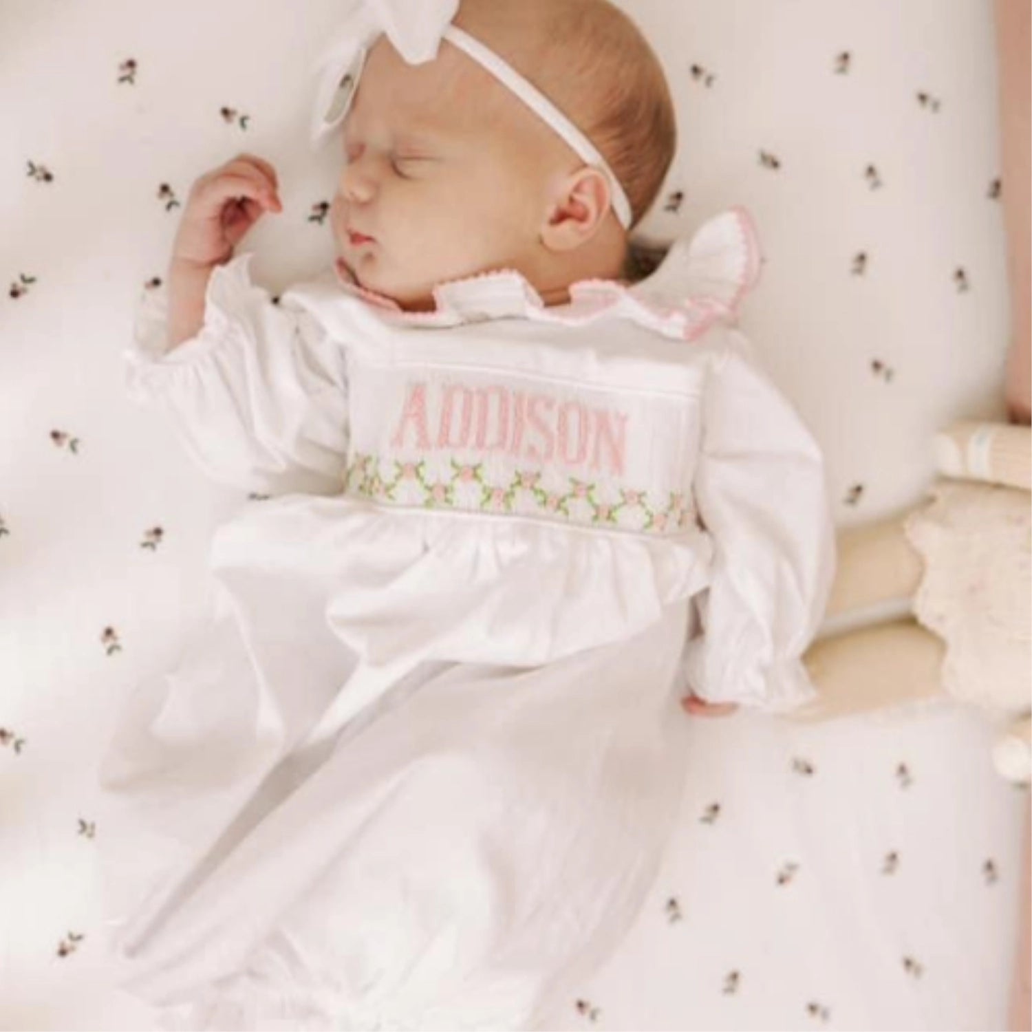 This adorable infant gown features a ruffle neck with unique tatter trim, the sweetest little rosebud smocking and can be customized with your little one's name. Perfect for coming home, a gift, newborn photos, etc!