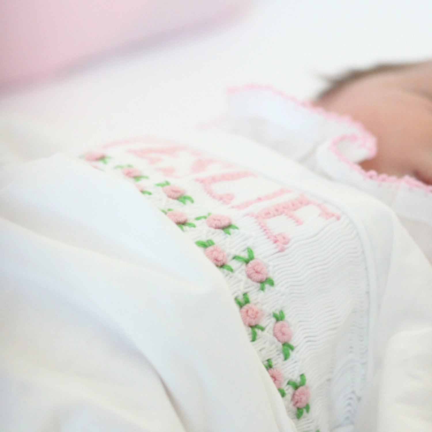 "Please note that these items are hand-smocked, and slight variations in lettering are part of their handmade charm. If you prefer perfectly uniform lettering, we recommend choosing a different style."