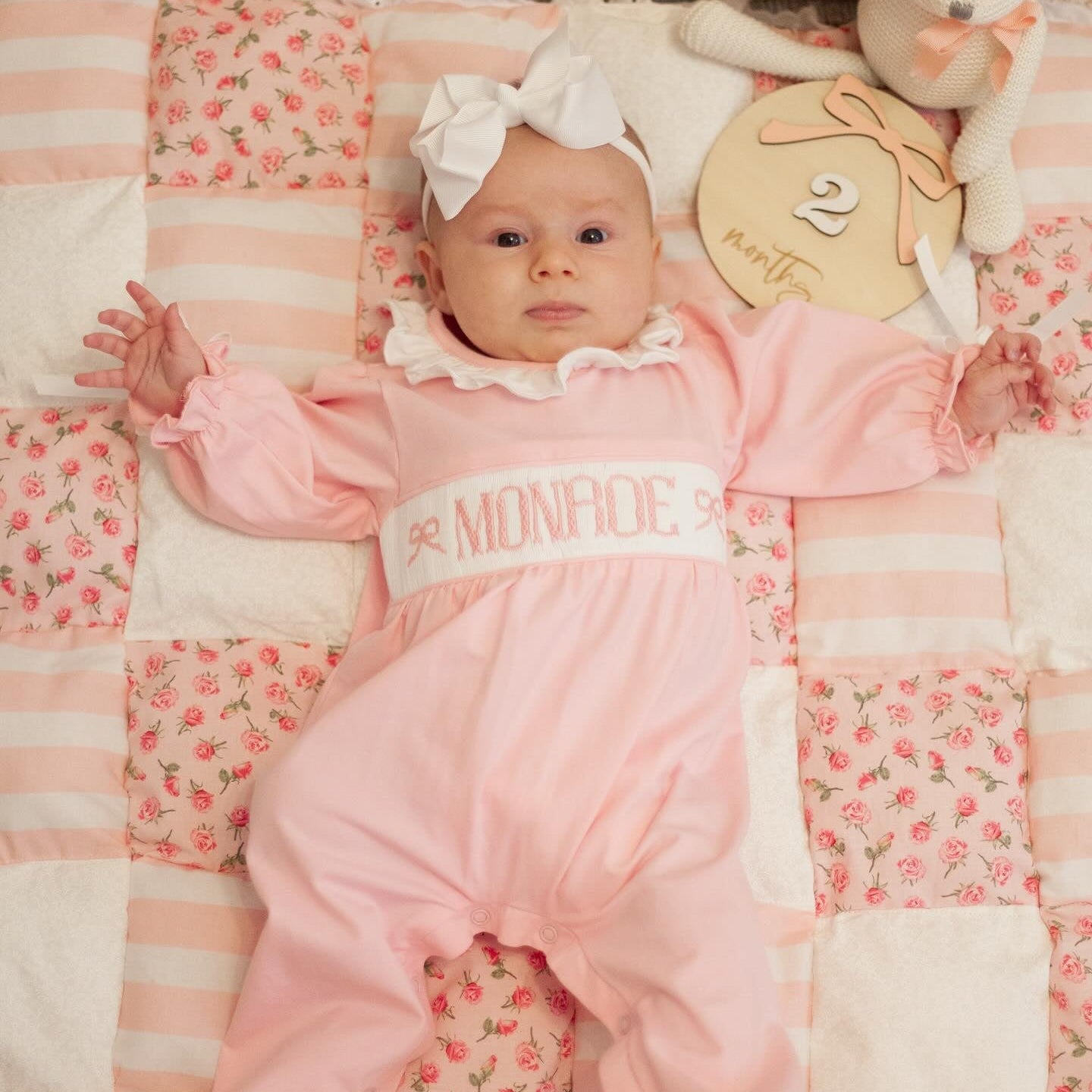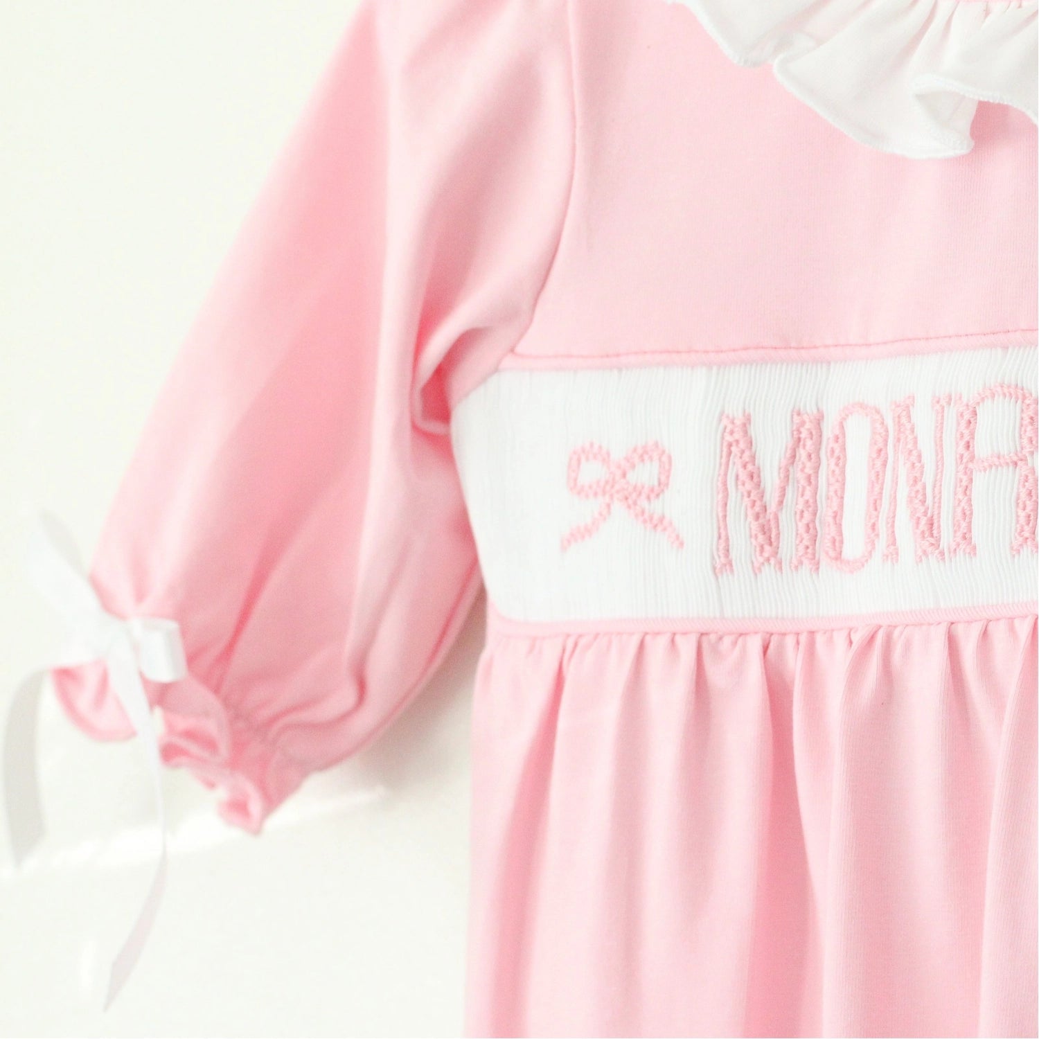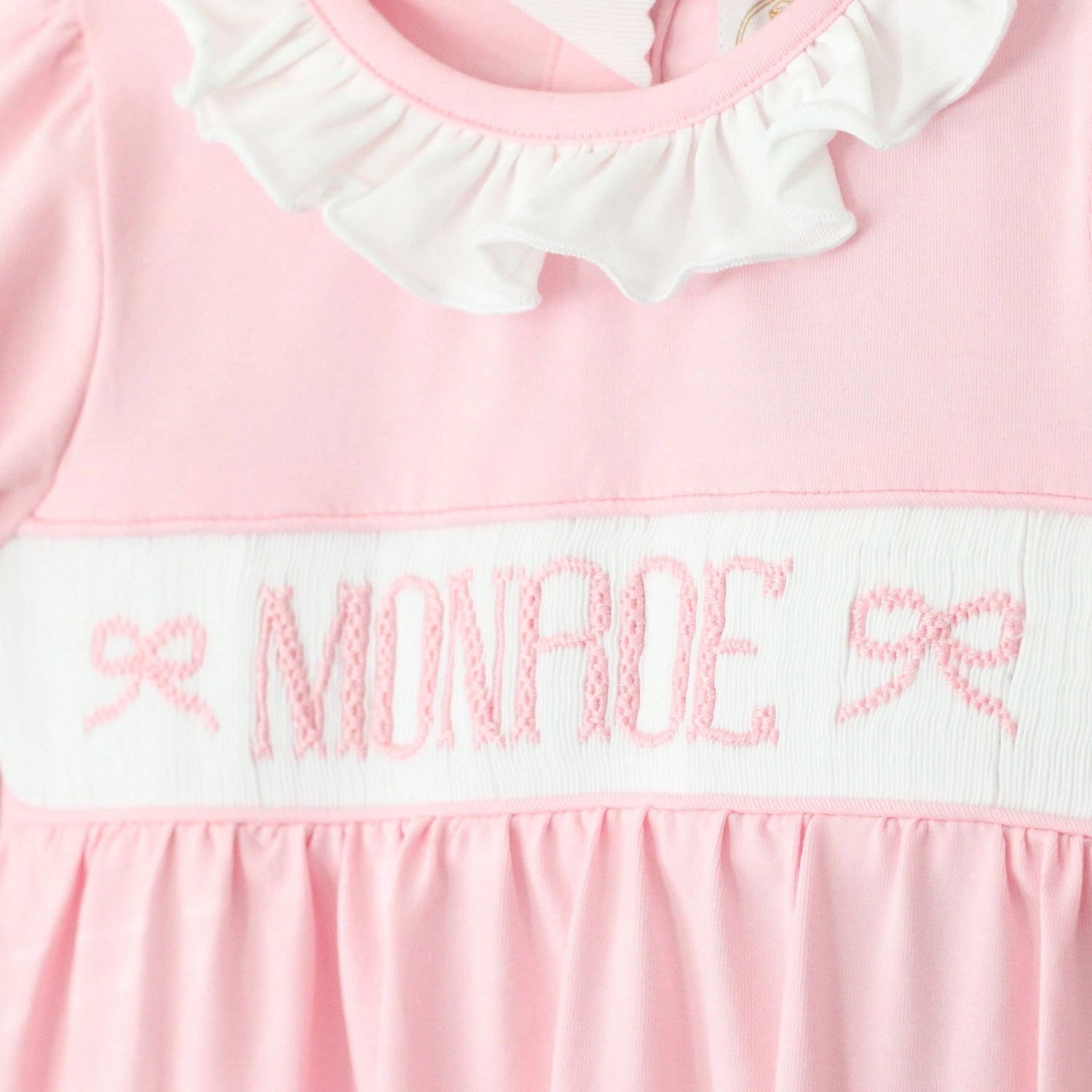 "Please note that these items are hand-smocked, and slight variations in lettering are part of their handmade charm. If you prefer perfectly uniform lettering, we recommend choosing a different style."